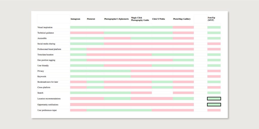 My competitive analysis showed that while numerous apps and companies offered either inspiration (Pinterest and Instagram) or technical guidance (Photographer’s Ephemeris and PhotoMap Gallery), very few offered both to a high standard. There really was a gap in the market for an app like FotoTip, and this helped guide me to what aspects I should prioritise when creating my Minimum Viable Product.