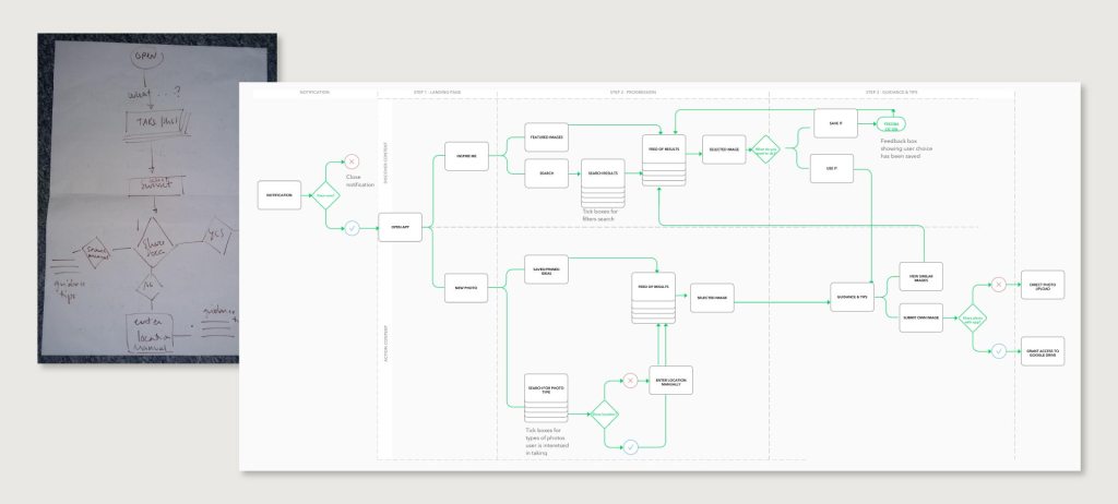 Once I had a clear user in mind, I began work on the app’s two clear user flows: inspire and action. The first draft of the user flow was created on paper to allow me to really focus on the most important aspects and not get bogged down by details, and this was followed by a mock up using post it notes on a wall so I could identify pain points and decide how I could link the two separate user flows together.
